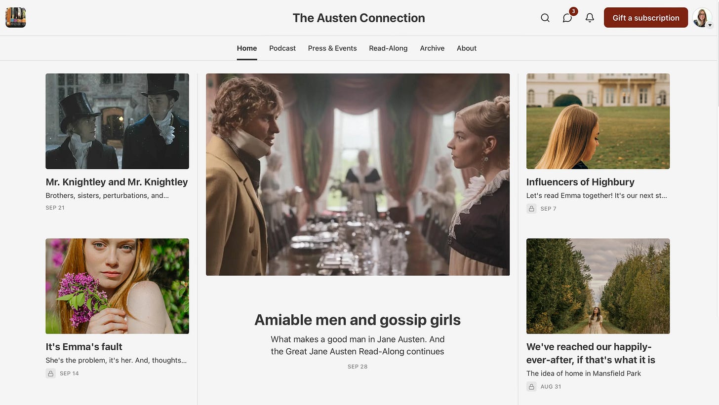 It probably hasn’t escaped your notice that I’ve been reading and writing about Jane Austen—a lot. When I returned to writing on Substack in January, I had no idea this was the turn my year and my words were going to take. I came back, as I’d left in 2023, ready to talk books and films and interconnections and rabbit holes—and then a newsletter from The Austen Connection appeared in my inbox that shifted the course of my year.